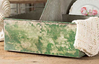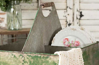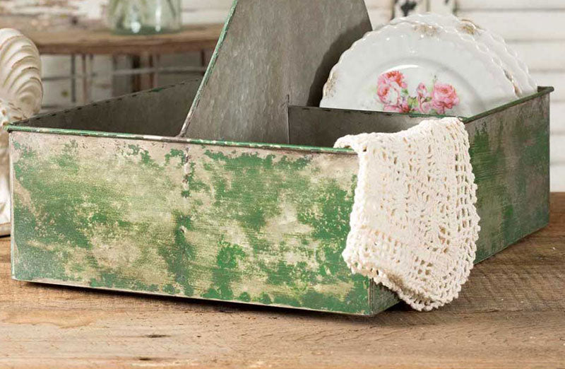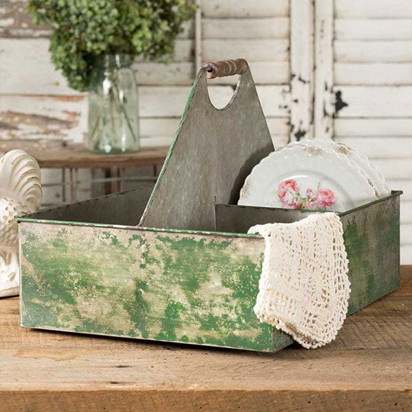 The vintage farmhouse look makes it so simply beautiful as if you picked it up on a Summer day from the nearby flea market. This sturdy metal cady with wooden handle is divided into three sections and can hold most anything! Bring a little farmhouse touch to your home and organize your cutlery pens brushes and tools. Or use this metal caddy as a center piece and display some of your seasonal harvest or fruits and vegetables. It Large size allows you to get creative and we can't wait to see what you all come up with :)