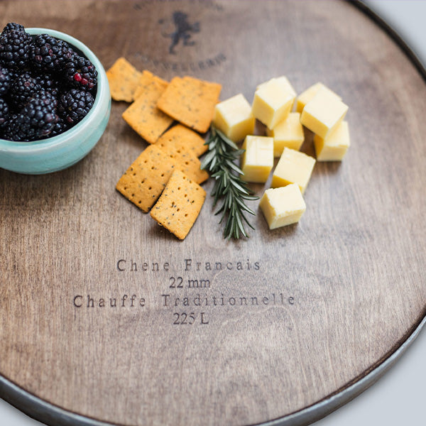 - Original French cooperage markings visible on wood surface