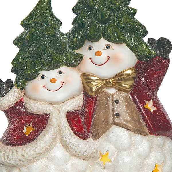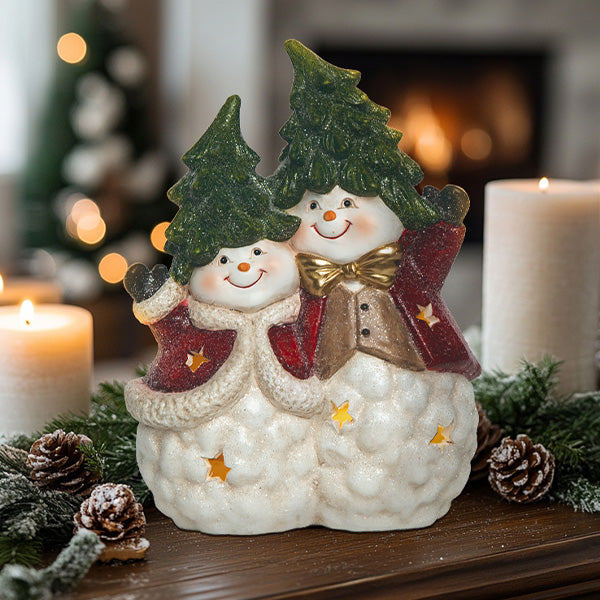 This festive Christmas decor piece combines classic winter charm with a playful twist, featuring two snowmen with cozy scarves and vibrant Christmas tree hats. Whether displayed on your mantel, tabletop, or as part of a centerpiece, these cheerful snowmen will instantly brighten up your space (figuratively and literally ;-) ).