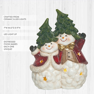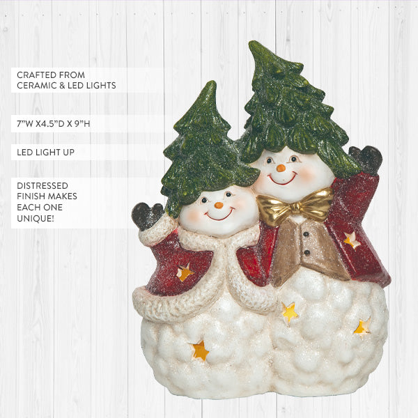 - Charming Design: Two snowmen with detailed scarves and bright tree hats, adding a playful holiday touch.