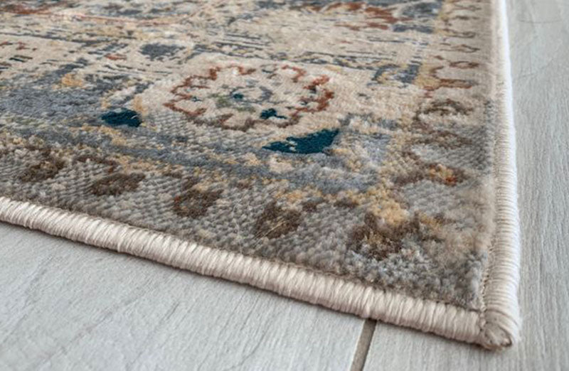 This accent rug is the definition of GORGEOUS and will bring luxurious style and instant charm to any room in your home. Featuring a sophisticated design and a richly modern color palette of neutral oatmeal and silver with blue and golden hues it truly doesn’t get better than this STUNNING area rug!