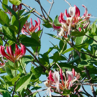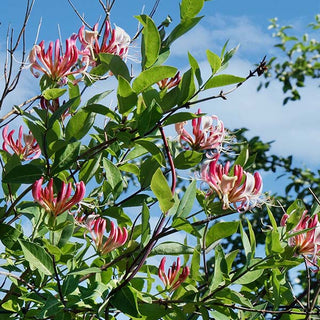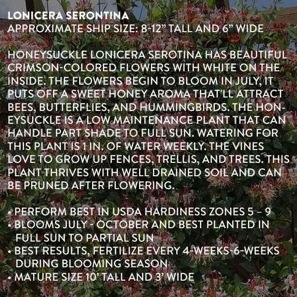 Honeysuckle lonicera serotina has beautiful crimson-colored flowers with white on the inside. The flowers begin to bloom in July, it puts off a sweet honey aroma that'll attract bees, butterflies, and hummingbirds. The honeysuckle is a low maintenance plant that can handle part shade to full sun. Watering for this plant is 1 in. of water weekly. The vines love to grow up fences, trellis, and trees. This plant thrives with well drained soil and can be pruned after flowering.