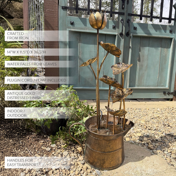 Solve all your stress by unwinding with our Antique Gold Lotus Leaf Water Fountain. Let the gentle sound of water cascading from leaf to leaf melt away tension and create a calming retreat in your home. Designed for ultimate relaxation, this stunning fountain features an antique gold finish that adds a touch of vintage elegance to any space. Whether placed indoors or outdoors, it’s the perfect statement piece to bring serenity and beauty to your surroundings.