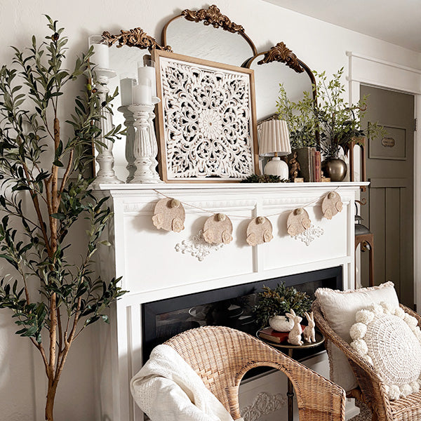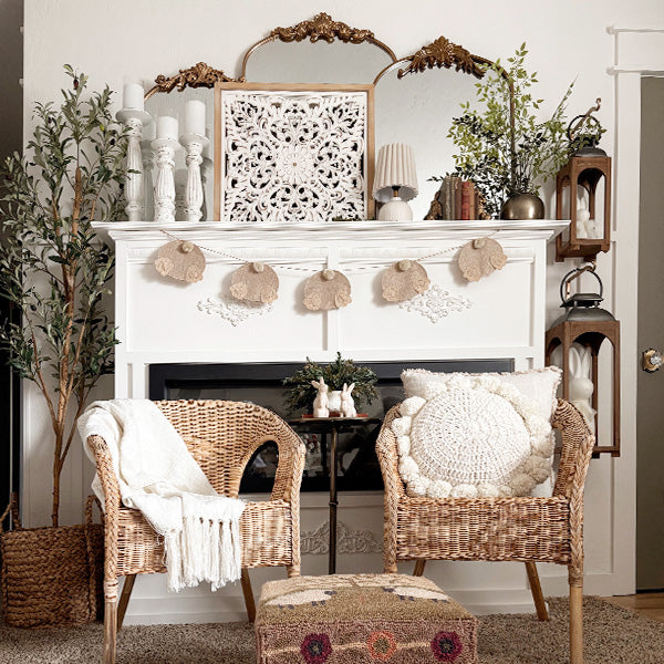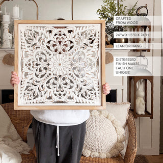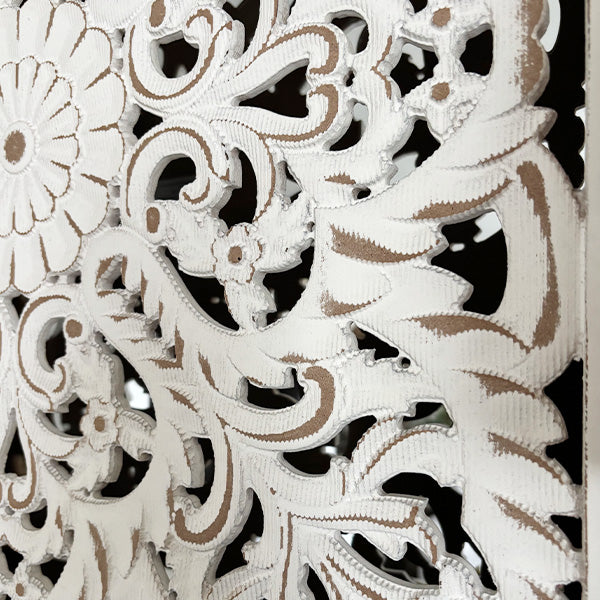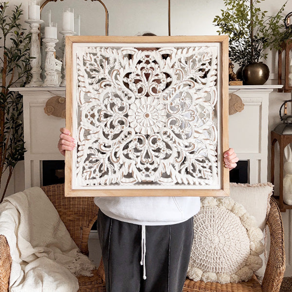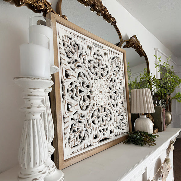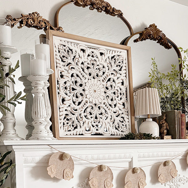 Rustic White Finish: Weathered white filigree set within a warm wooden frame creates a vintage-inspired look perfect for cottagecore, boho, or modern farmhouse settings.
