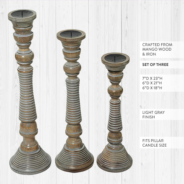Introducing our Mango Wood Pillar Candle Holders, Set of Three—a versatile trio that seamlessly blends vintage charm with modern elegance. Crafted from durable mango wood, these candle holders feature a soft light gray finish that fits effortlessly into any decor style. The three different sizes create a dynamic display, perfect for adding dimension and warmth to your space.