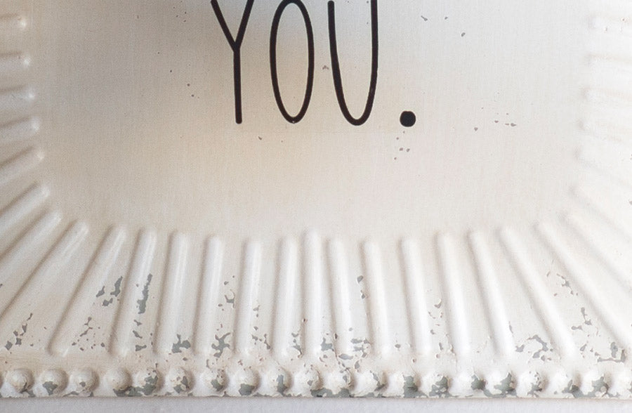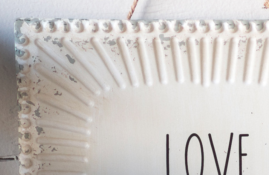 A great way to add a loving tone and atmosphere to any space our Distressed Metal Love You Sign will complement the look of your home with its classic and neutral design. Crafted of metal with a chippy white finish the scalloped edges and vintage look of this sign will add a sweet touch to your farmhouse-inspired home.