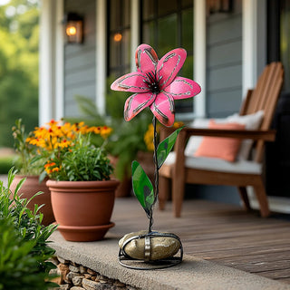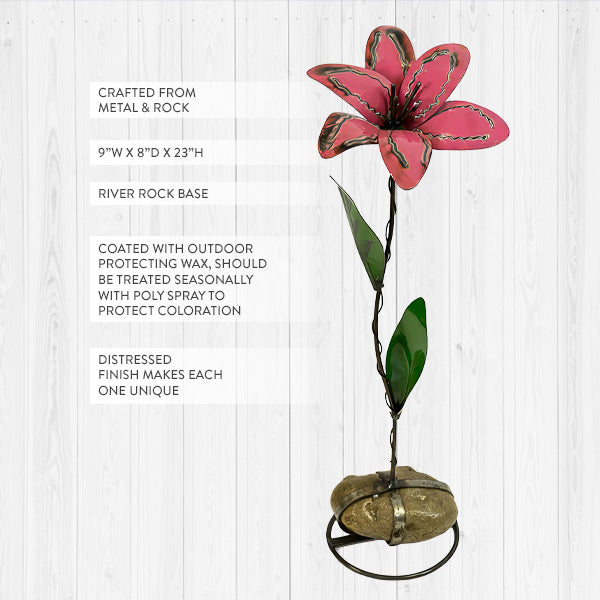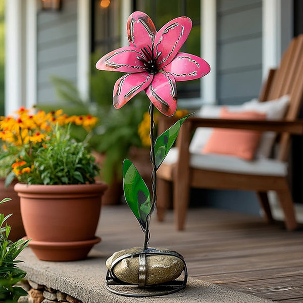 This isn't your grandmother's artificial flower – it's a stunning metal sculpture with a vibrant pink finish and natural green leaves that delivers all the beauty of fresh blooms without any of the hassle. Perched on a genuine river rock base and protected with outdoor wax coating, this charming piece stands strong through every season while you sit back and relax.