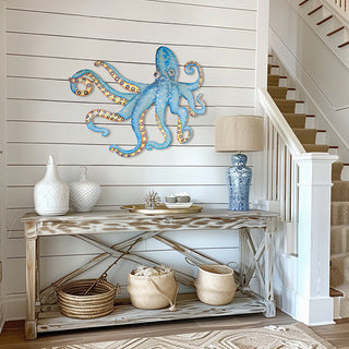 Transform your coastal farmhouse with our Recycled Hammered Metal Octopus Wall Decor. Crafted with meticulous detail and sustainable materials, this stunning piece captures the essence of coastal decor with its intricate design and rustic charm. Adorn your walls with this unique octopus art to bring a touch of the sea into your home, creating a captivating focal point that perfectly complements your coastal farmhouse aesthetic.