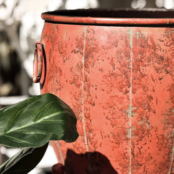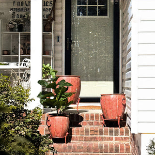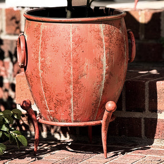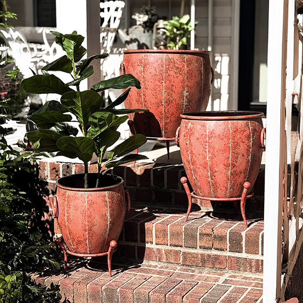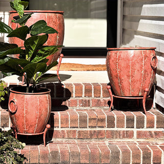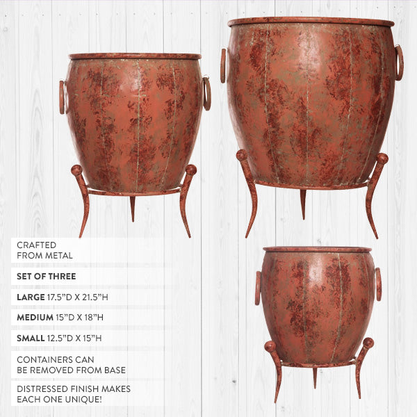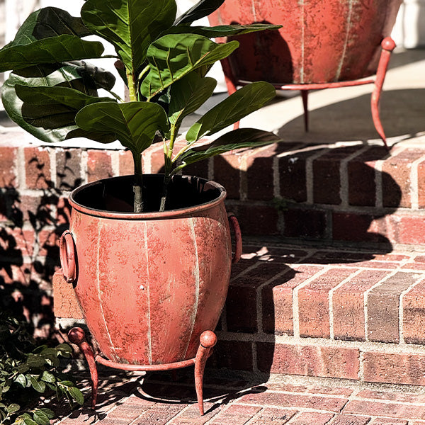 Add a touch of vintage charm to your indoor or outdoor space with this set of Rustic Metal Planters with Removable Stands. With their distressed red-brown finish and elegantly curved legs, these planters bring an old-world feel that blends beautifully with farmhouse, rustic, or industrial décor.