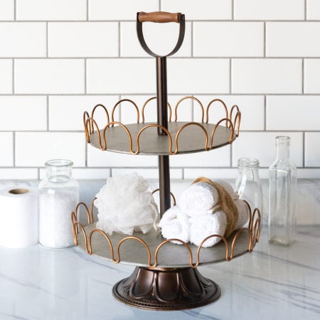 The two tiers allow you to organize a different selection on each tray. Each tiered galvanized stand will be ideal for keeping supplies snacks and fruits & veggies. Or picture these scalloped trays layered with seasonal decor in the kitchen or on your foyer table. Use them in your office space or craft room as the perfect way to hold and store all your items. Put one of these scalloped trays in the mudroom to hold keys and smaller items. Hmmm…you could even use these in the bathroom to hold everyday essentials.