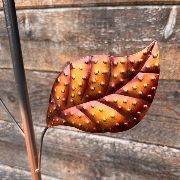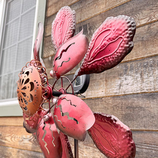 Vibrant Flower Designs: The set showcases two distinct flower designs—one in a captivating blue with eight metallic petals featuring a shimmery, iridescent finish and white wavy patterns, and the other in rich reddish-pink tones. Both flowers boast bronze/copper-colored centers and decorative metal leaves attached to their long metal stems, adding sophistication to your outdoor decor.