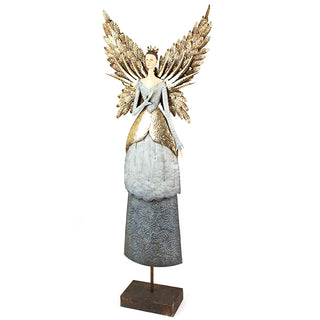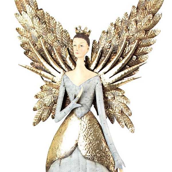 Her presence is unmistakable. Crafted from painted metal with a sophisticated champagne gold and soft white palette, she stands tall with wings that catch the light in all the right ways. The textured detailing on her flowing dress adds dimension and depth, while those ornate gold wings create a backdrop that's both dramatic and graceful.