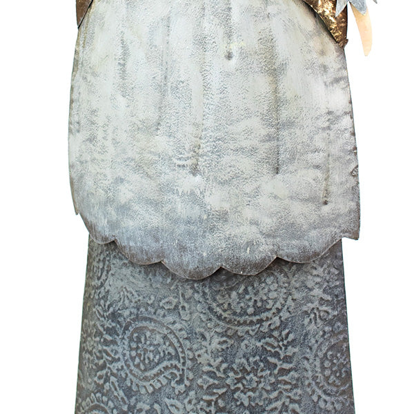 Her presence is unmistakable. Crafted from painted metal with a sophisticated champagne gold and soft white palette, she stands tall with wings that catch the light in all the right ways. The textured detailing on her flowing dress adds dimension and depth, while those ornate gold wings create a backdrop that's both dramatic and graceful.
