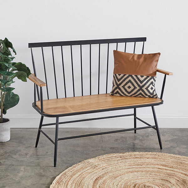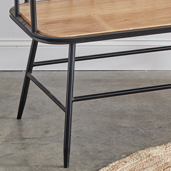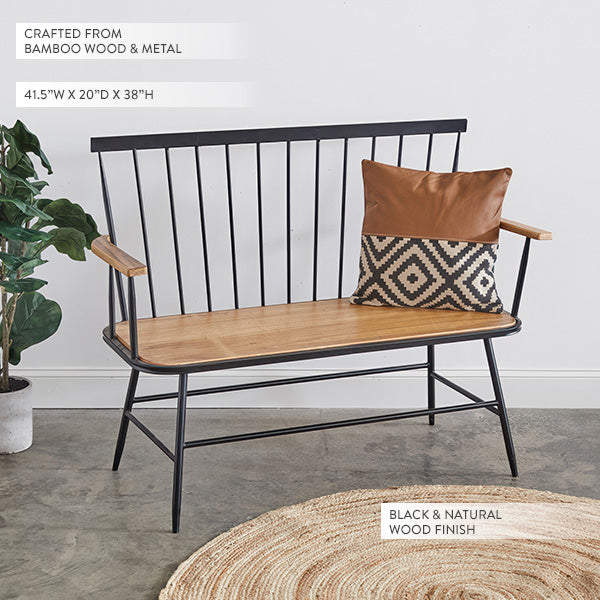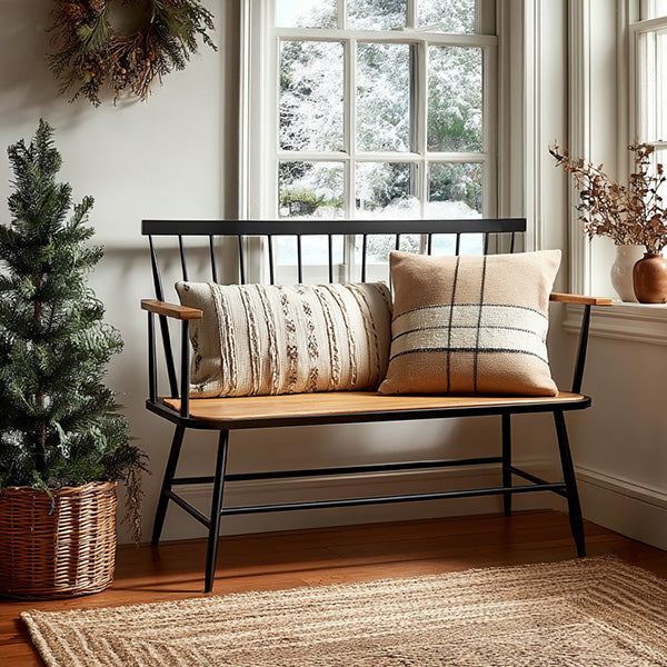 The black metal frame paired with warm bamboo wood creates that perfect modern-meets-farmhouse vibe. Those classic spindles aren't just for show—they support your back when you're pulling on boots or catching your breath.
