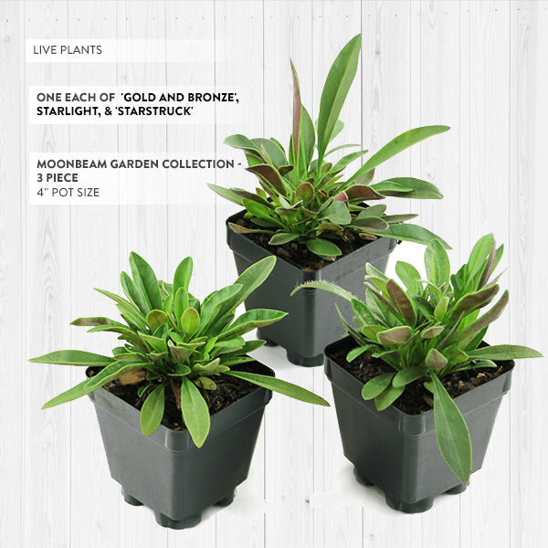 Illuminate your landscape with the magical shimmer of our Moonbeam Garden, Set of 3. This trio of LIVE plants was hand-selected to deliver otherworldly color, glowing foliage, and soft contrast.