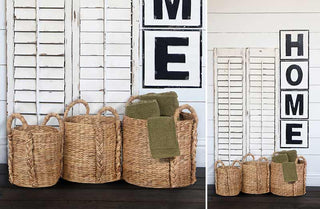 We love the use of these baskets placed among your vintage themed fireplace holding your favorite throw blankets and magazines for those cozy movie nights. Put these baskets in your laundry room to separate your worn clothes and instantly give the space a Farmhouse atmosphere... These are also great in the bathroom to hold larger toiletries and even in the kid's room to organize toys! The possibilities are always endless with Farmhouse baskets!