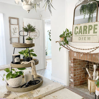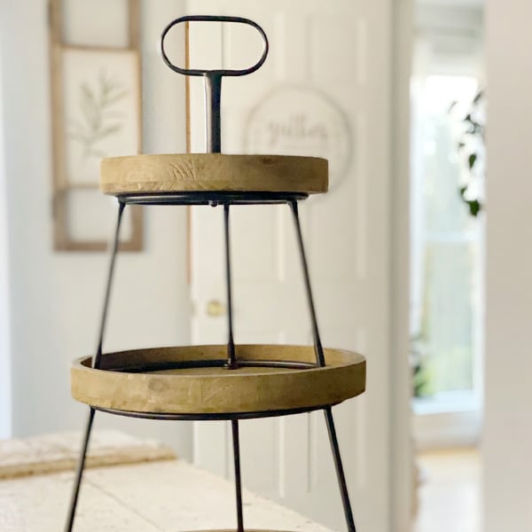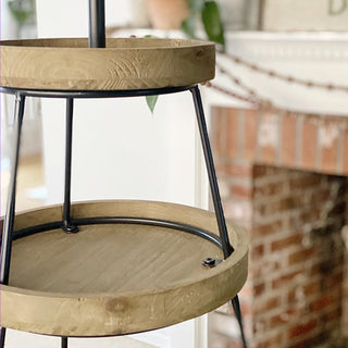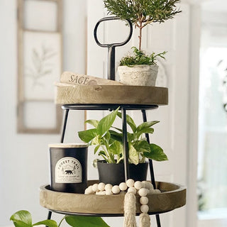 This Natural Wood Tiered Tray with Metal Stand is super sweet and will look even sweeter in your home! We can see it decorated with mini cupcakes, muffins, biscuits, and tiny tea sandwiches (just make sure you line it when using with food). This is the PERFECT size for your hors d’oeurves for a small dinner party! This piece will be beautiful styled with gourds, pinecones, ornaments, Easter eggs, flowers and even candles as part of a centerpiece on your dining room table! The possibilities are truly ENDLESS with this wood-tiered tray!