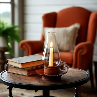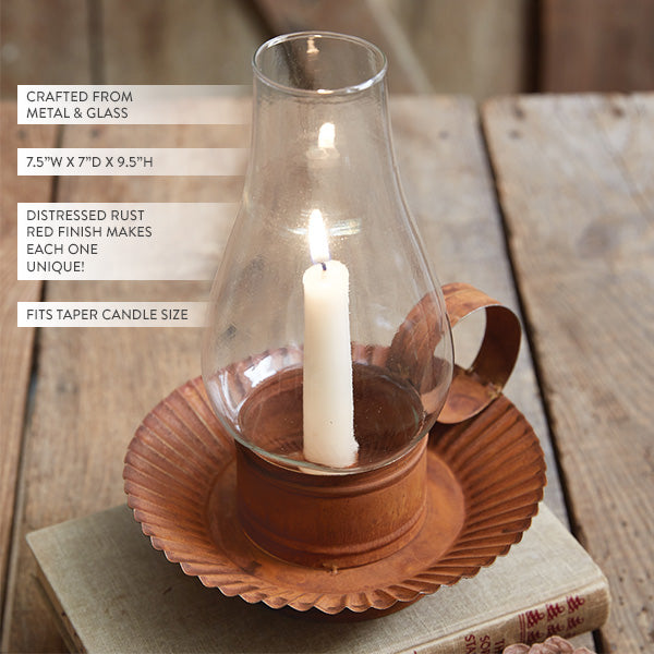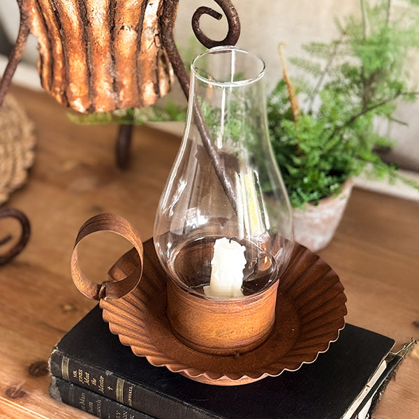 Remember those classic stories where characters would carry a candle to light their way up the creaky stairs to bed? That’s the magic of a chamberstick! This isn't just any candle holder; it's a nostalgic nod to a simpler time, designed to feel like a one-of-a-kind treasure you found at a vintage market. The rustic, distressed metal base and scalloped rim give it that perfectly imperfect, farmhouse-chic feel, while the tall glass hurricane protects the flame, adding a layer of cozy, intimate glow to any space.