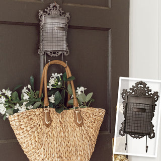 Simply hang this Ornate French Style Wall Basket with Hooks on any wall and you will have you essentials at an arms reach all while creating a breathtaking focal point! This charming piece can hold your mail, leashes and light jackets near the front or back door! Use the hooks to hold small seasonal wreaths and the basket for cascading garland during the holidays! This would be perfect for soaps in the bathroom, wooden cooking utensils in the kitchen or anything in between! We are seriously in LOVE!