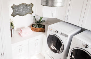 Charming Farmhouse Design: Classic typography and weathered finish bring timeless farmhouse flair to your laundry space.