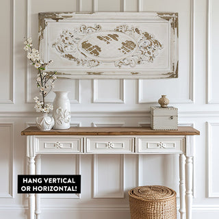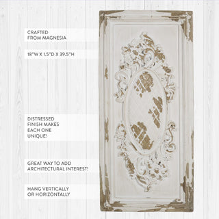 Introducing the 39 Inch Cottage Core Ornate Wall Panel, a stunning piece inspired by ornate boiserie designs that effortlessly infuses vintage elegance into your home decor. Crafted with meticulous attention to detail, its weathered textural effects delicately coated in a simple white finish create a one-of-a-kind, timeworn aesthetic that adds character to any space.
