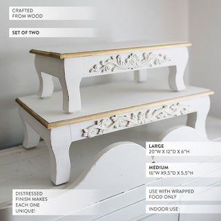 Why should you buy these Antique Inspired Ornate White Wood Risers? They are not just functional but also serve as beautiful decorative accent pieces that can transform any space. Their timeless design and versatile use make them a perfect addition to any home decor, whether you're aiming for a modern farmhouse look or a more traditional style. Add these risers to your collection and enjoy the charm and elegance they bring to your home.