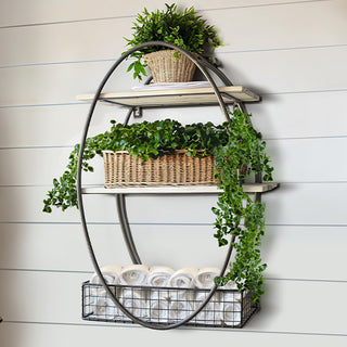 Elevate your living space with the Metal and Reclaimed Wood Oval Wall Shelf—a statement piece that not only organizes your belongings but also enhances the overall aesthetic of your home.