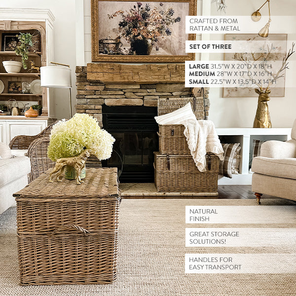 You know that feeling when you've got blankets spilling out of the closet, toys taking over the living room, or a mountain of pillows with nowhere to go? We've all been there. But what if we told you that you could solve all of your storage woes with one stylish and seriously stunning solution? Our set of three rattan trunks is a storage dream come true! Stack them up for a chic, rustic-farmhouse look in a corner, or spread them out and use one at the foot of your bed, one as a stylish coffee table, and the other to wrangle those toys in the playroom. The possibilities are endless!