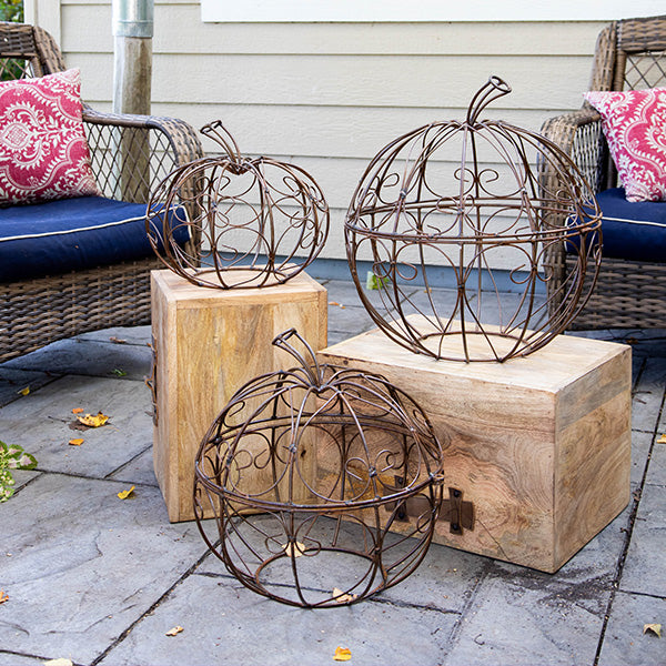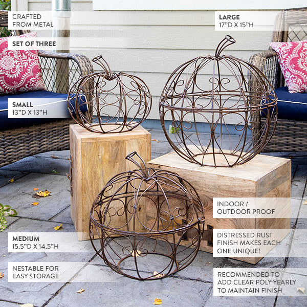 Our Set of 3 OVERSIZED Rustic Metal Scroll Pumpkins is giving all the magical, whimsical vibes you crave for fall. Handcrafted with gorgeous swirling scrollwork and finished in rustic metal with a clear poly coat, these pumpkins are sturdy enough for outdoor decorating yet charming enough to style indoors.