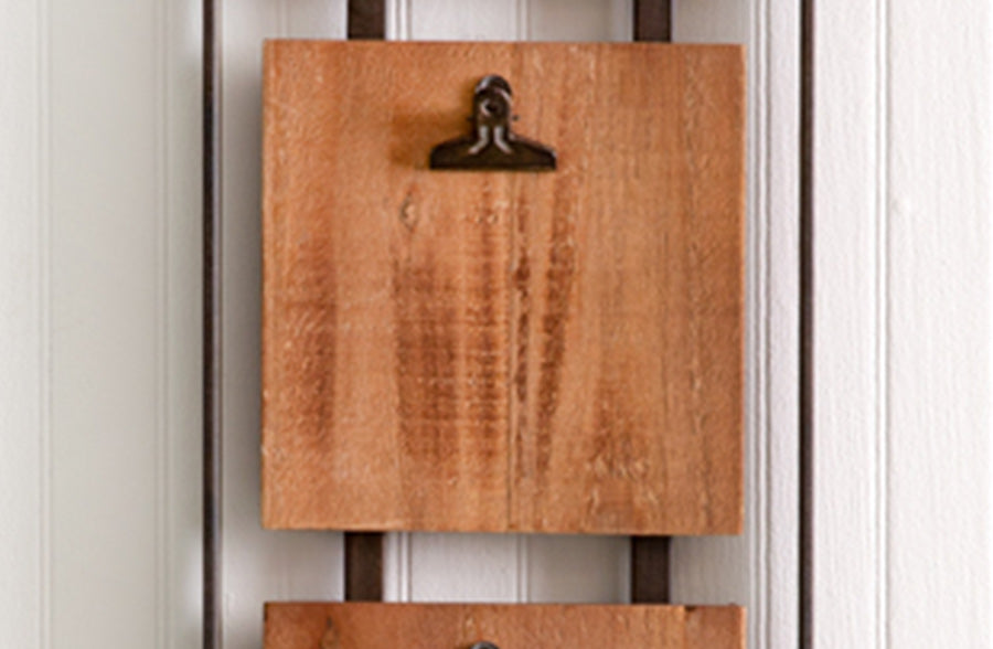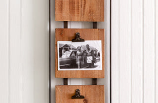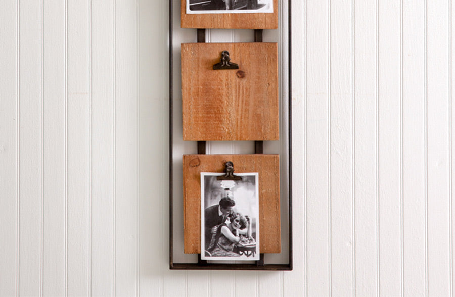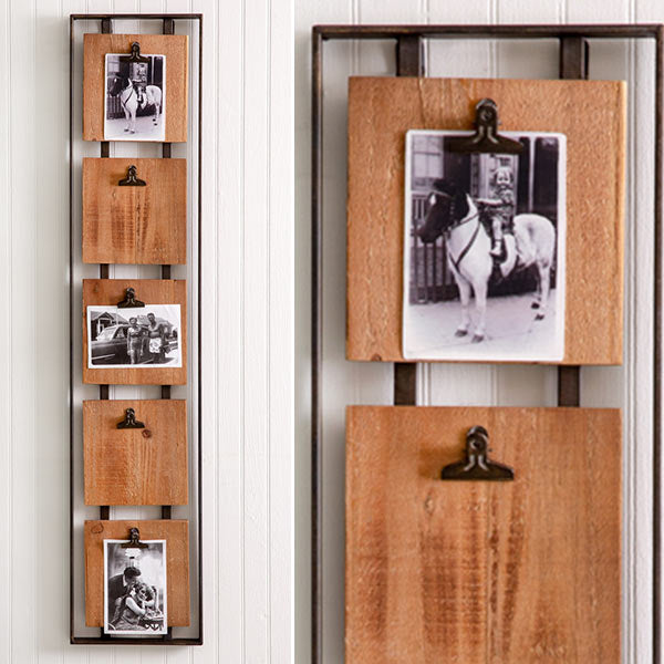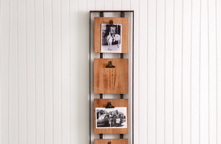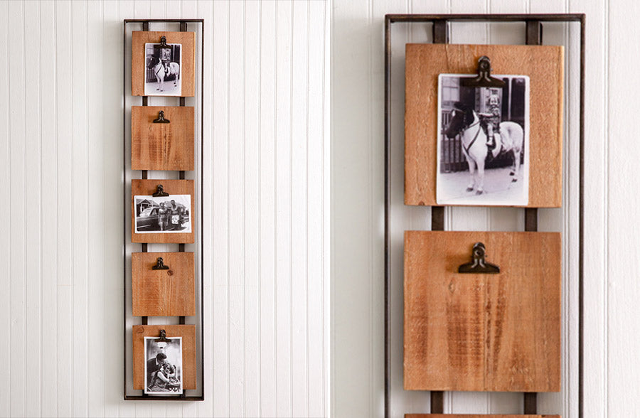 This hanging photo holder includes five metal clips along wooden square frames making it great for displaying photos cards recipes and more. Hang this versatile piece in your entryway living room or office and have it radiate vintage-inspired vibes throughout your home.