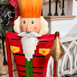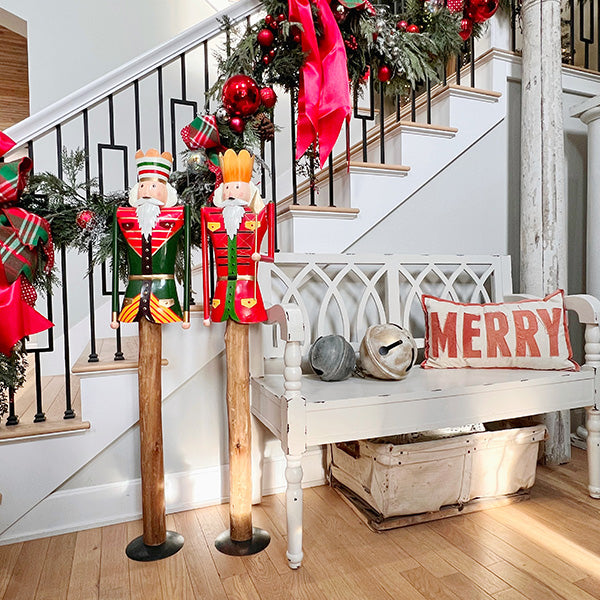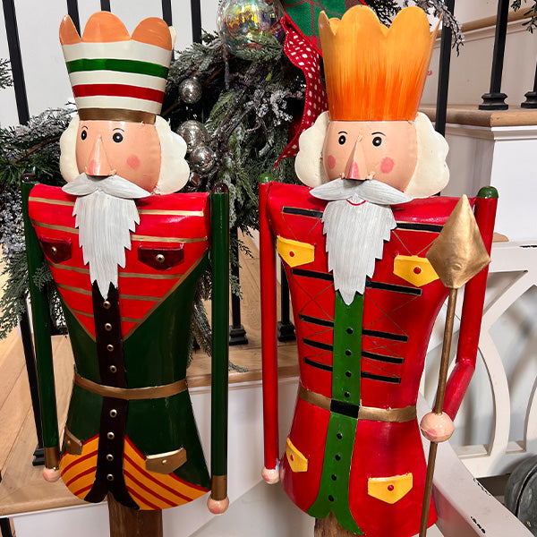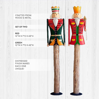 Bring a burst of holiday spirit to your Christmas decor with this Tall Painted Metal and Wood Nutcrackers, Set of two, featuring one in vibrant red and the other in classic green. At 48 inches, these towering figures are ready to stand guard over your festivities. They'll have you humming the song the Dance of the Sugar Plum Fairy. Their distressed finish adds a vintage touch, making them a timeless holiday staple.