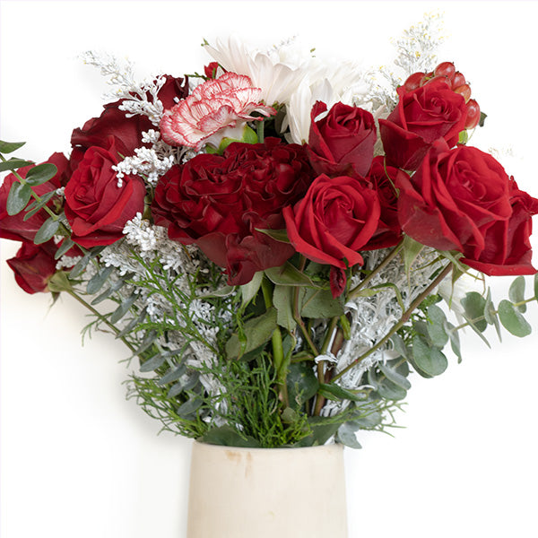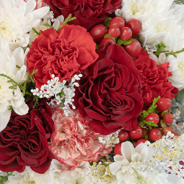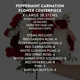 Transform your special events with the Peppermint Carnation Flower Centerpiece—a delightful prearranged collection of festive florals. Featuring red roses, spray roses, white mums, red and peppermint carnations, hypericum berries, and more, this centerpiece is thoughtfully designed to add a touch of seasonal magic to any setting.