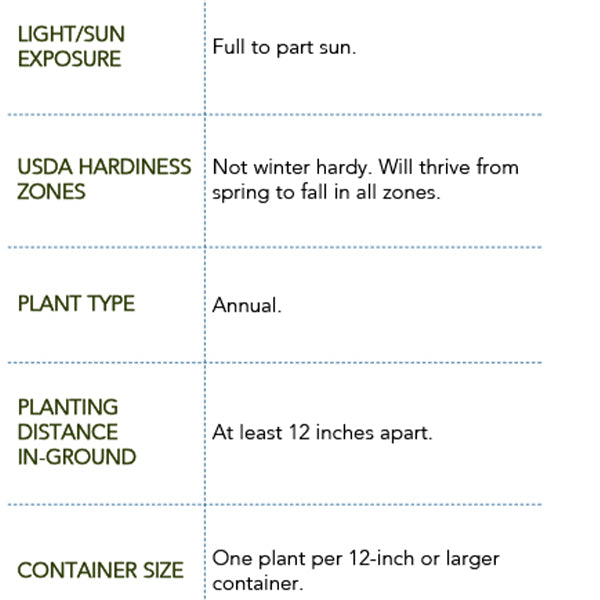 - Best grown in USDA hardiness zones 5-9, can be grown as an annual in any part of the country