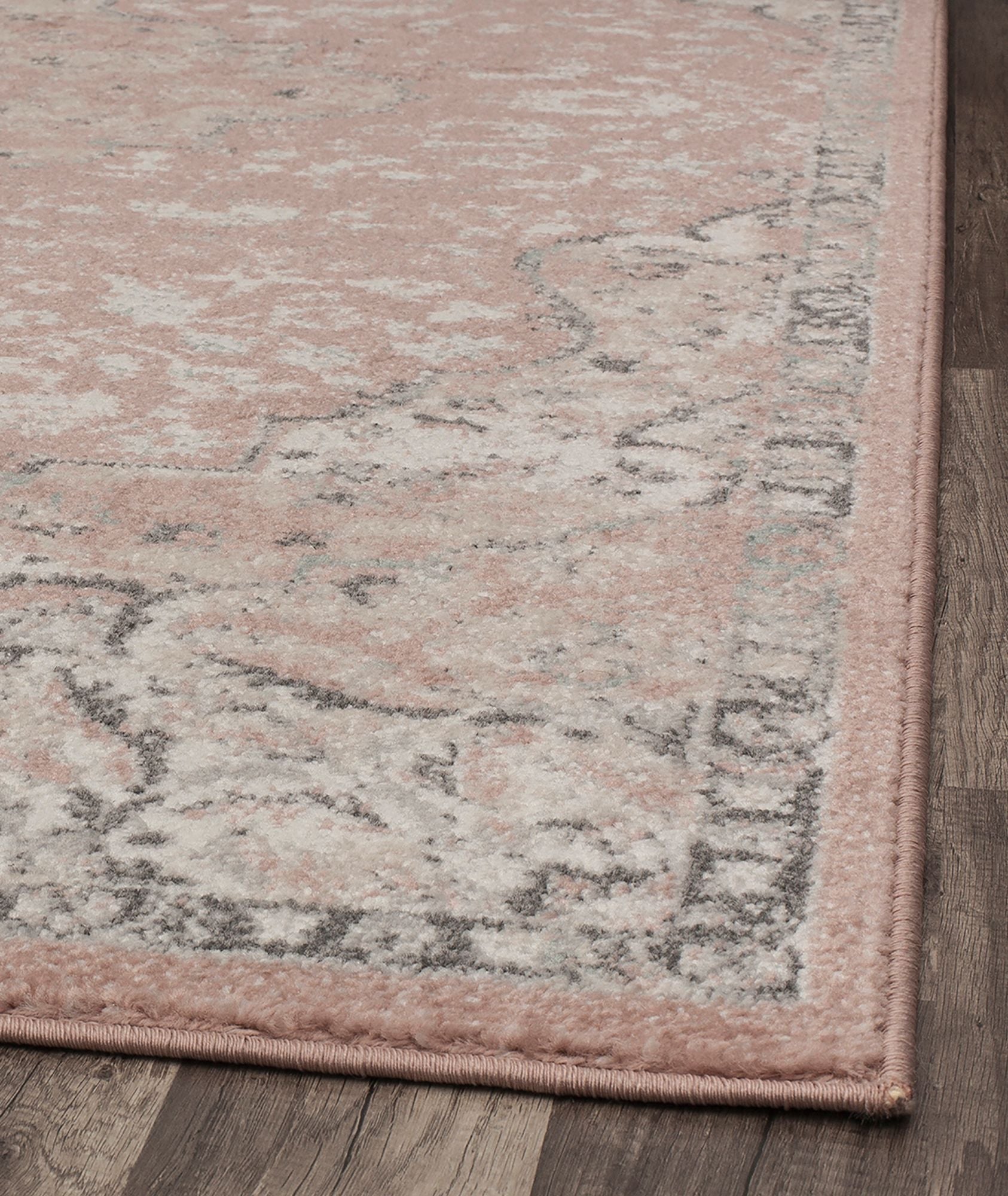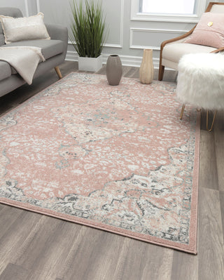 Introducing the Pink Amaranth Area Rug. This elegantly designed rug features curved lines and a subtly distressed majestic motif in pink, grey, and ivory. Power-loomed with a half-inch pile, it adds a note of grandeur to your living or dining room. The soft-touch, shiny finish ensures both form and function, providing durability and visual appeal. Enhance your space with the Hailey Transitional Pink Area Rug and redefine your personal style with its vibrant and delicate patterning.