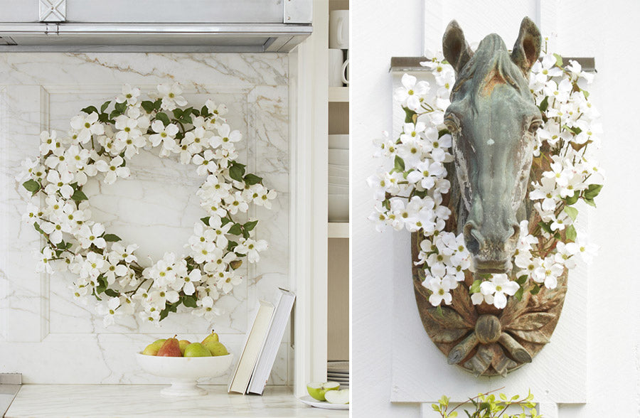 This dogwood wreath will look STUNNING hanging in ANY room in your home! Style this in your kitchen, on your pantry door, or on any empty wall. Hang this dogwood wreath in your living room, dining room, bathroom, bedroom, or office! We LOVE the idea of this hanging in your entryway to welcome your guests with so much charm! We can even see it laying flat on your dining room table as part of a centerpiece! And of course, you can hang this on your front door!