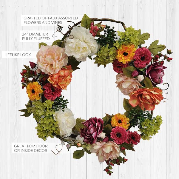 - Packed: One Per Package (you will receive one Mixed Floral and Vine Wreath)