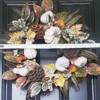 - Beautifully crafted from faux pumpkins, gourds, and fabric leaves in colorful Autumn hues