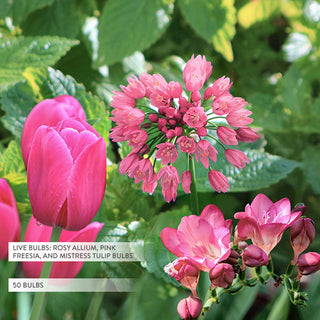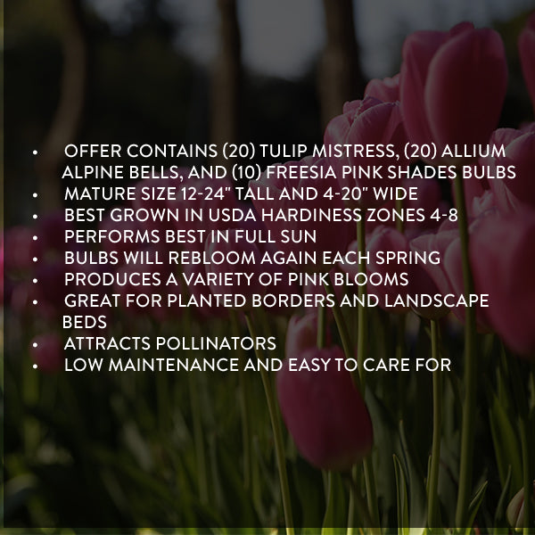 - Includes 50 bulbs – (20) Tulip Mistress, (20) Allium Alpine Bells, and (10) Freesia Pink Shades