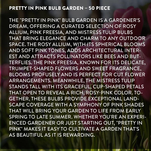 Turn your garden into a pink paradise with the Pretty in Pink Bulb Garden! This hand-selected collection of Rosy Allium, Pink Freesia, and Mistress Tulip bulbs creates a breathtaking display of soft, romantic hues from early spring to late summer. Whether you’re designing a formal garden or a whimsical cottage retreat, these vibrant blooms offer elegance, fragrance, and pollinator-friendly appeal to any outdoor space.