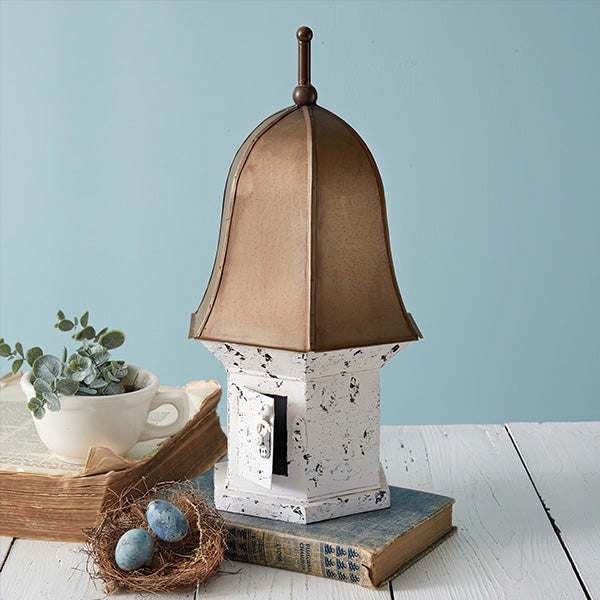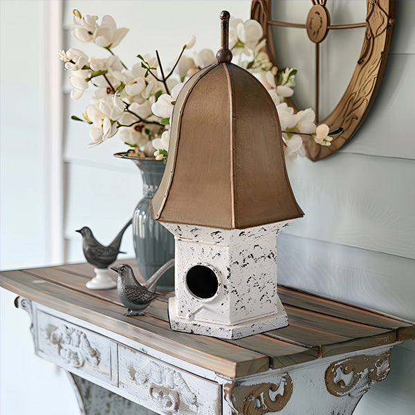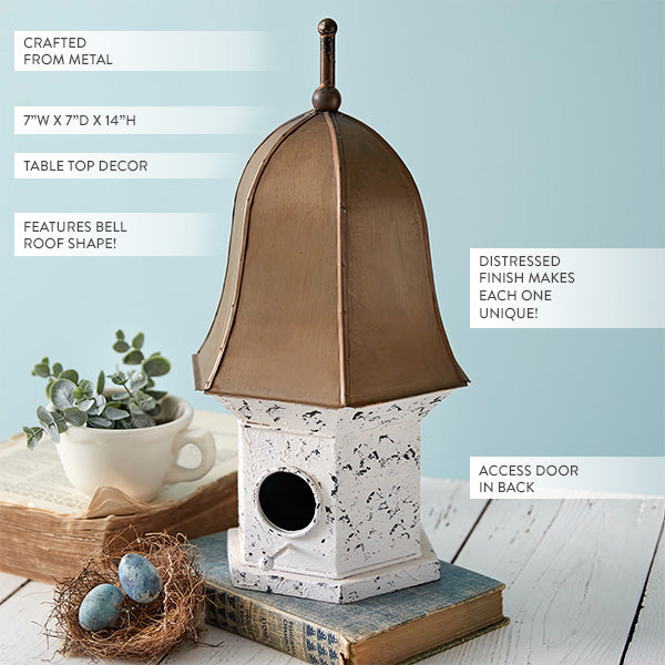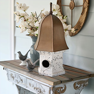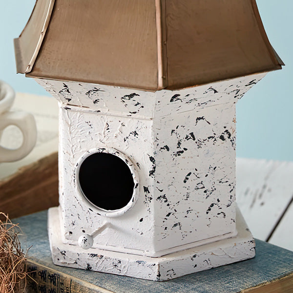 Our Queen Anne Bird House is a graceful addition to your indoor decor that exudes timeless charm. Adorned with distressed paint and an antique metal bell roof, this meticulously crafted piece boasts a convenient trapdoor at the back for effortless maintenance, providing both elegance and practicality to your living space.