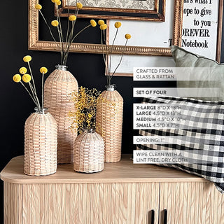 Perfect for adding a natural touch to your home, this set of rattan-wrapped glass vases is a must-have for those who love effortless, stylish decor. Whether grouped together or spread throughout your space, they bring warmth and texture to any room.