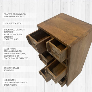 Designed after a true antique, our Brickmold Cabinet provides the perfect storage solution for your smaller supplies and essentials. This shabby chic chest of wooden drawers has a functional design, distressed finish, and tons of rustic appeal that will trick anyone into thinking you paid big money at an antique store! With TEN drawers crafted to resemble vintage brick molds, this LARGE piece will make such a statement among your farmhouse decor!