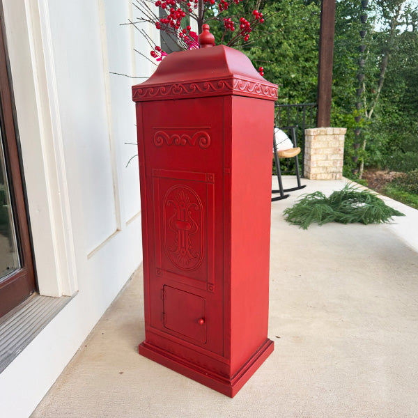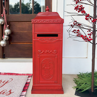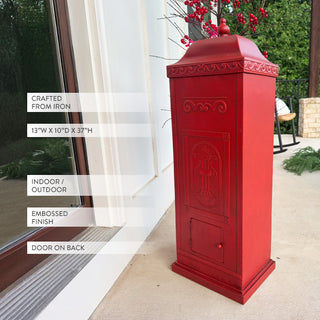 Add timeless charm to your entryway, porch, or hallway with our Vintage Red Iron Mailbox Tower. Designed with elegant scrollwork and a rich red finish, this 37-inch tall mailbox blends classic appeal with durable function. The secure drop slot makes it ideal for collecting letters, cards, or suggestions, while its slim profile allows it to fit seamlessly against a wall or beside a doorway. Whether placed outdoors under a covered porch or inside your foyer, it delivers bold style and practical use all in one.