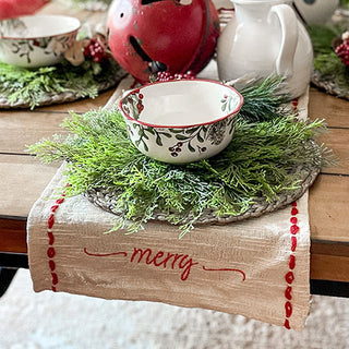 Not only is this table runner absolutely beautiful but also the perfect addition to your Farmhouse space! We are looooooving the red trim detail, the beautifully scripted "merry" sentiment and ahhhhhmazing quality of this beauty! Place it on your vintage farmhouse table this holiday season! AND the neutral color is versatile enough to pair well with all types of décor for years and years to come!