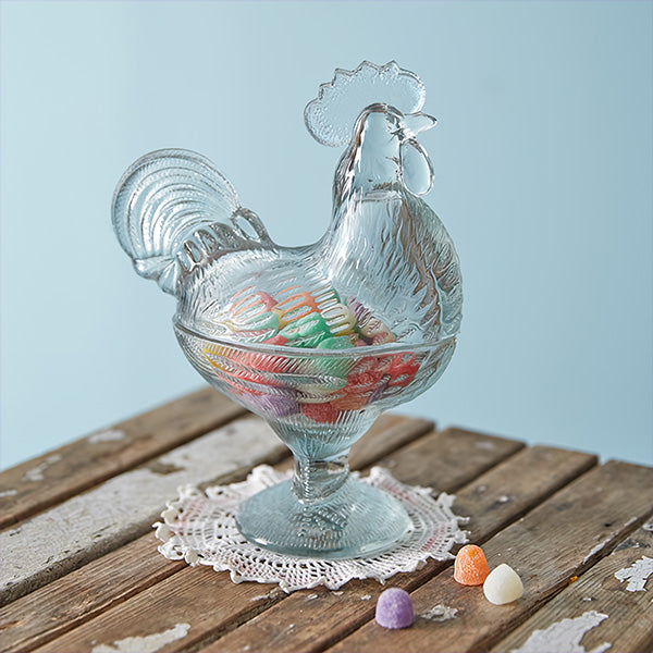 Introducing our Glass Rooster Candy Dish – a charming and functional addition to your kitchen. Perfect for displaying treats, its clear glass design and rooster motif bring a touch of farmhouse flair to your tabletop. Elevate your decor with this delightful and versatile candy dish.