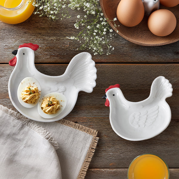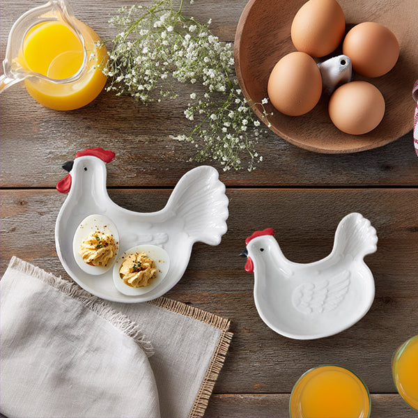 Bring a little barnyard charm to your table with our Farmhouse Friends Serving Plates, Set of Two! These cluckin’ cute plates are the perfect way to add a playful, farmhouse touch to your kitchen or next gathering. Designed with delightful details like a proud comb and feathered wings, these roosters are ready to rule the roost — whether you’re serving up deviled eggs, appetizers, or sweet treats!