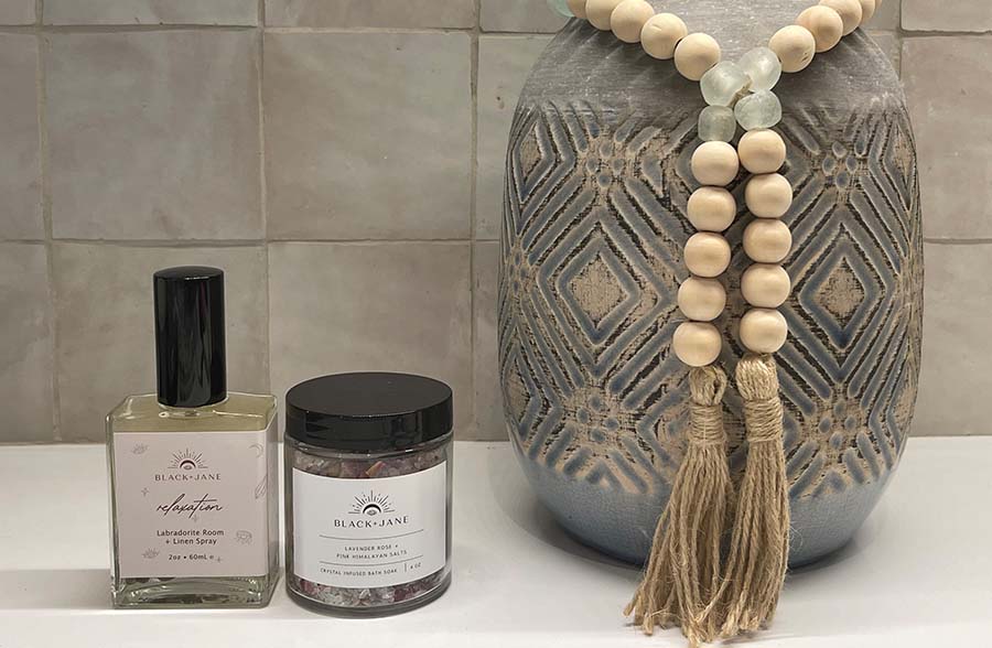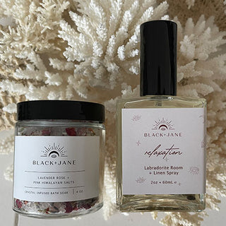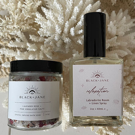 - Bath Soak: Lavender + Pink Himalayan Salt bath soak, infused with a sun charged Rose Quartz stone