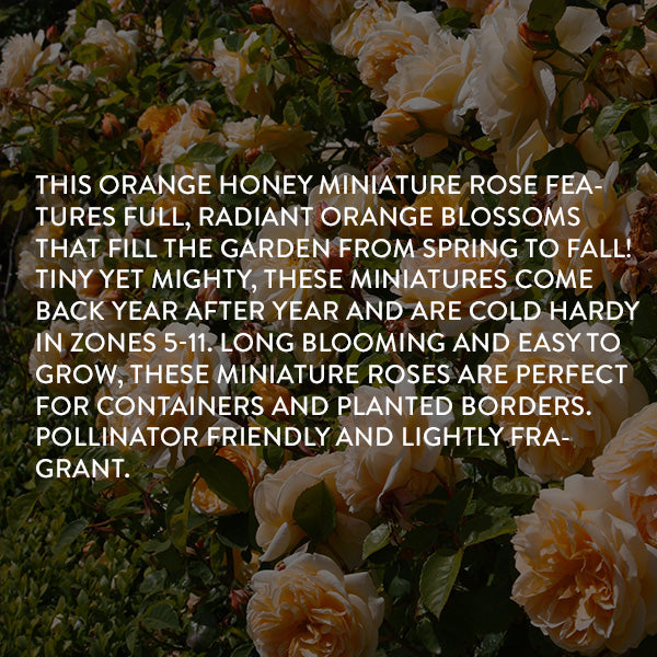 This Orange Honey miniature rose features full, radiant orange blossoms that fill the garden from spring to fall! Tiny yet mighty, these miniatures come back year after year and are cold hardy in zones 5-11. Long blooming and easy to grow, these miniature roses are perfect for containers and planted borders. Pollinator friendly and lightly fragrant.