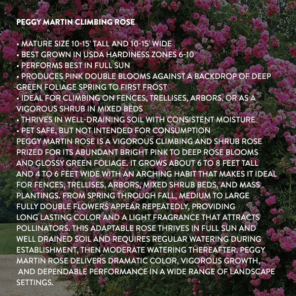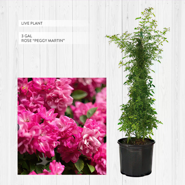 - Packed: One per package (you will receive one live Peggy Martin rose plant in a pot)