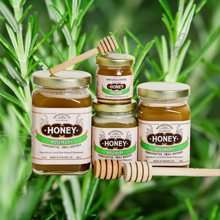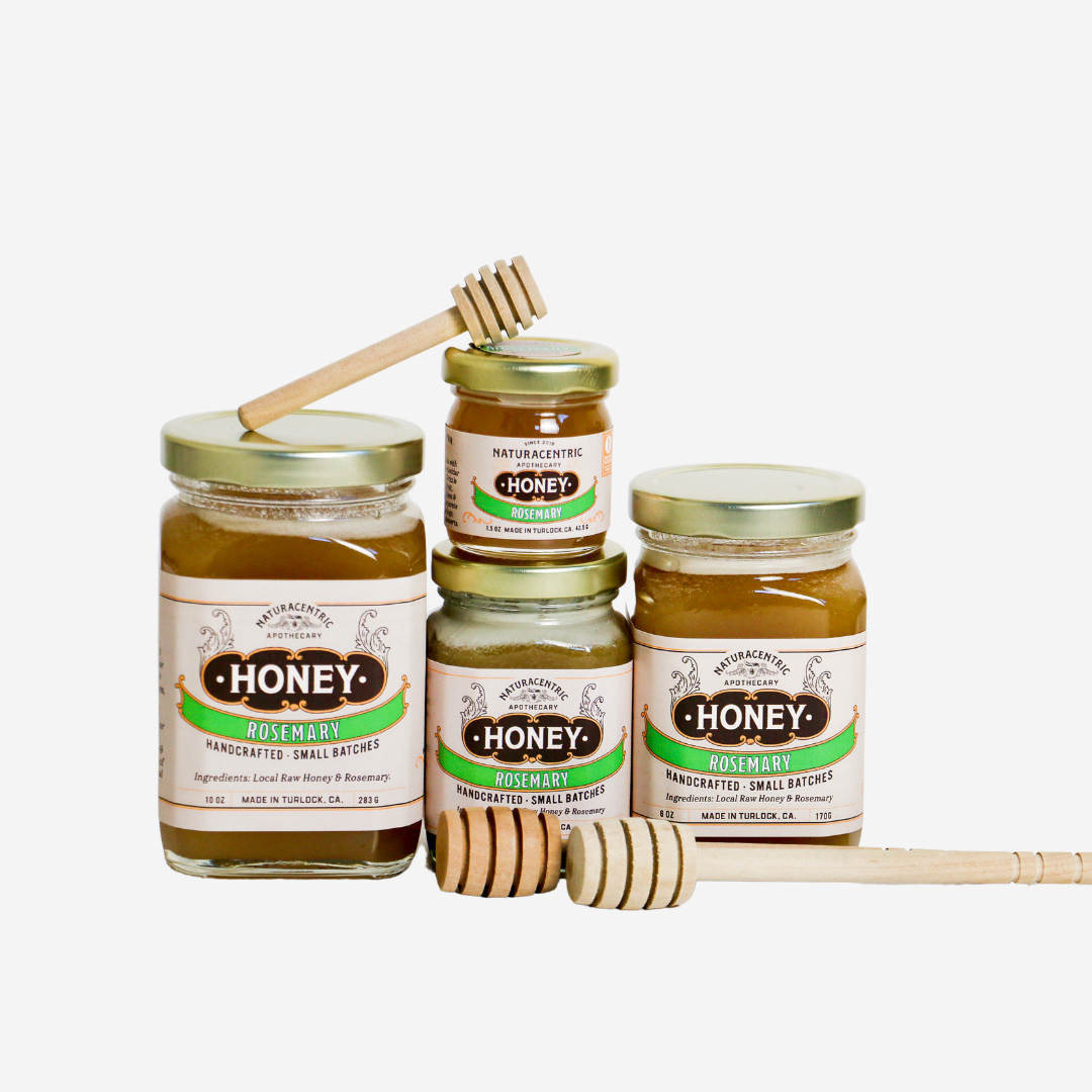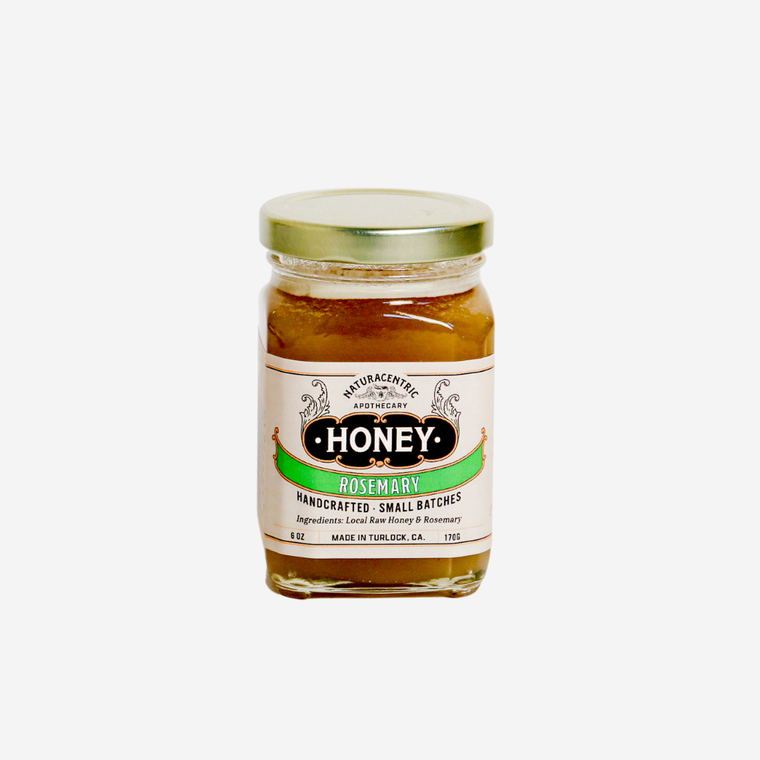 This Hazy Raw Local Honey is paired with Rosemary Sprigs.